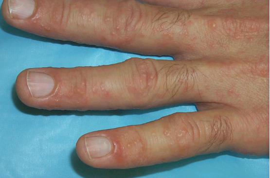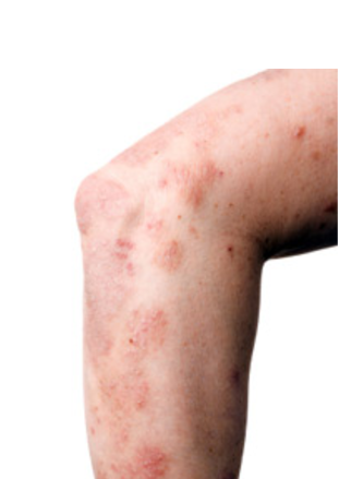 *sharply defined discoid/coin-shaped lesions on dorsum of hands, feet, and extensor surfaces (knees, elbows)