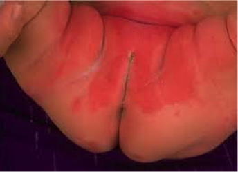 erythematous macular rash along the skin folds where the diaper rubs, with possible annular satellite lesions