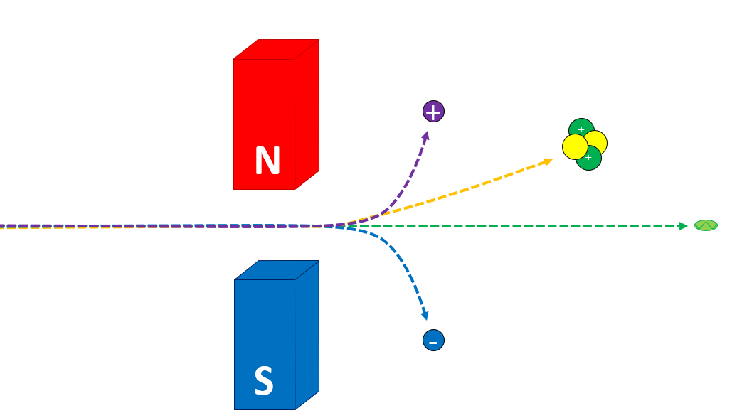 β- → Equal and opposite deflection to β+ (Equal and opposite specific charge)