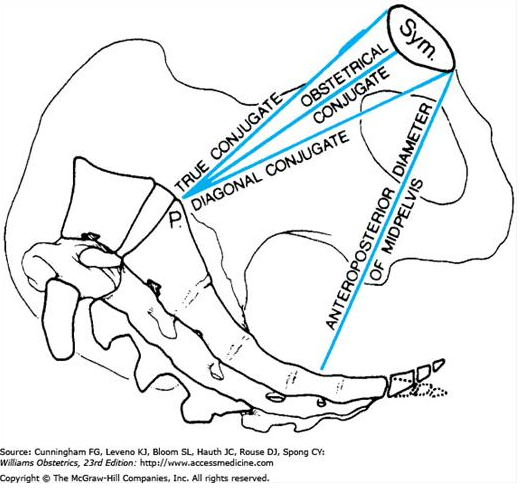 Conjugata diagonal: borda inferior da sinfise pubica ao promontorio (~12 cm)