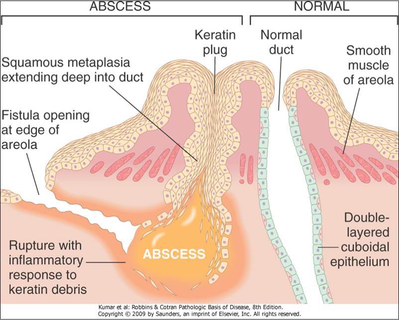 Inflammation of the subareolar lactiferous ducts. Commonly seen in smokers. (smoking leads to a vit. A deficiency which alters the ductal epithelium)