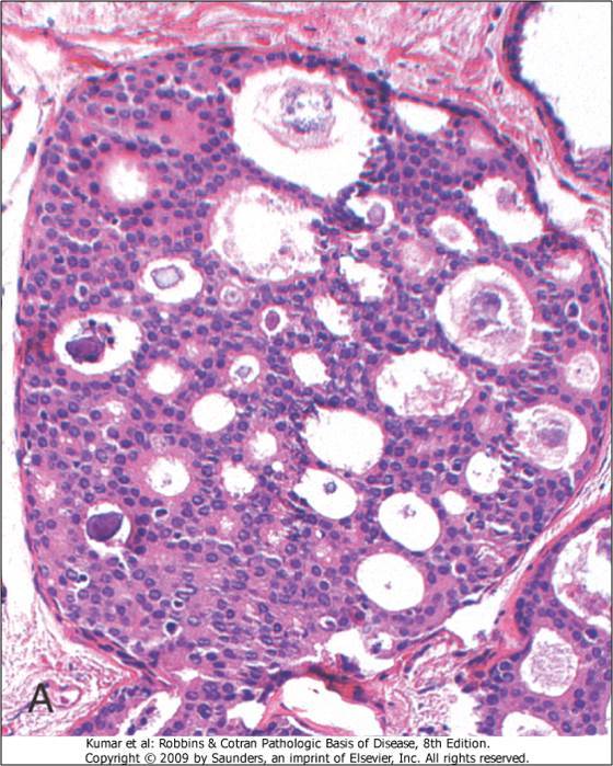 Malignant ductal cells of the lactiferous ducts. Can spread thru the lobules and create calcifications.