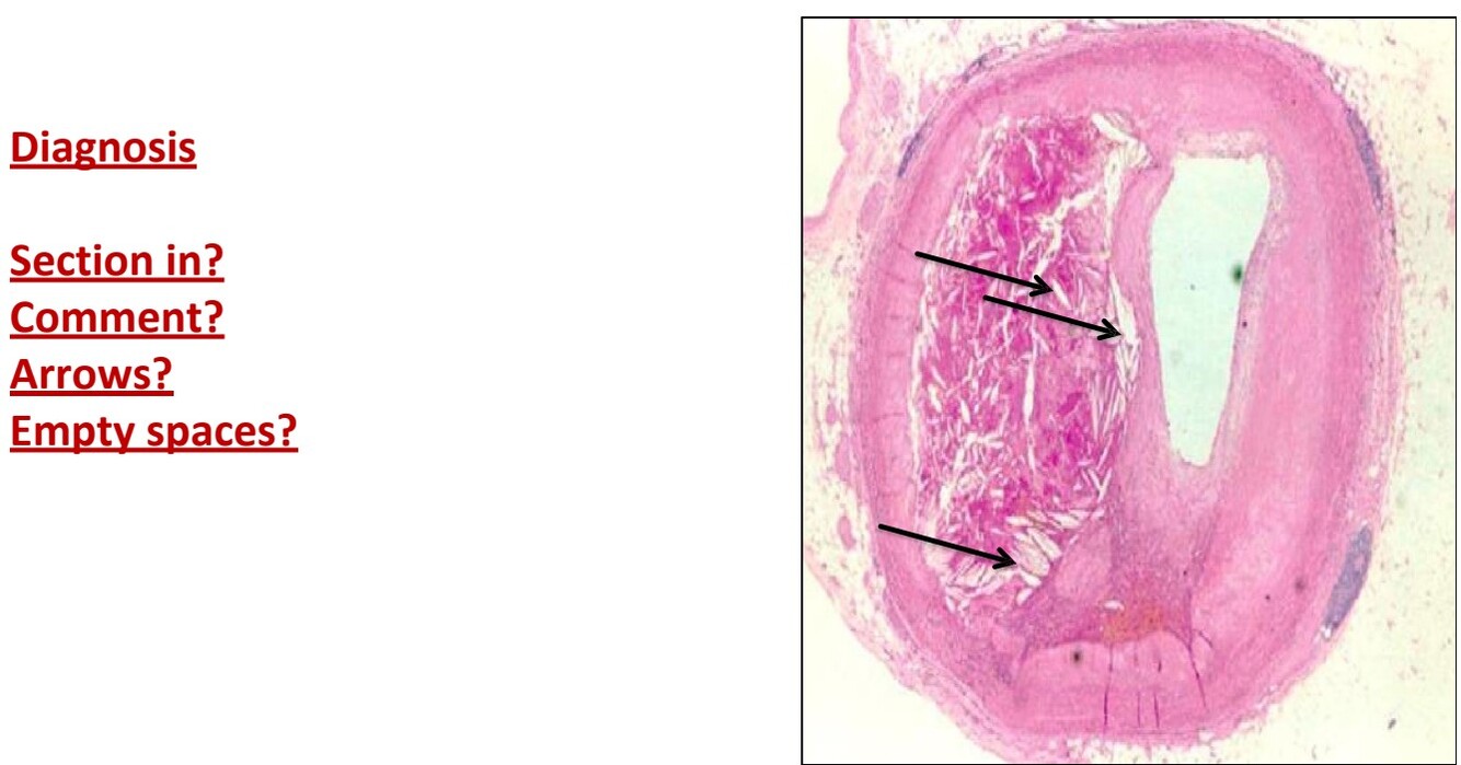 Infraction shows structureless pink area. Red and white pulp appear as GHOSTS