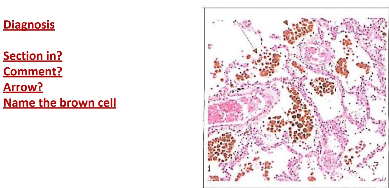 Alveolar spaces contain transudate, entangling red cells and hemosiderin granules (the BROWN CELL)