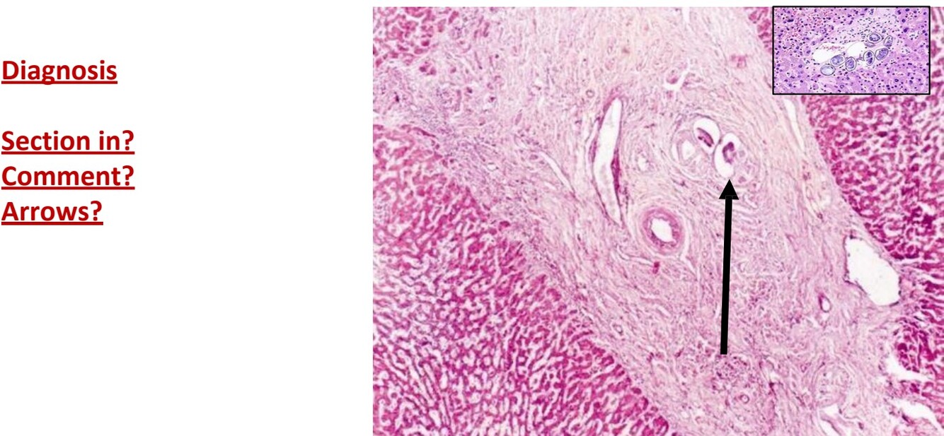 Portal tract is side fibrinous due to bilharzial ova and is surrounded by bilharzial reaction (lymph, plasma cells, macrophage)