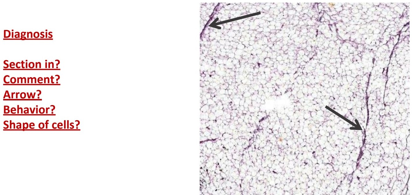 Fibrous capsule surrounds tumor creating fibrovascular septa