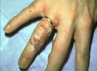 Contact dermatitis. Vesiculobullous on his hands.