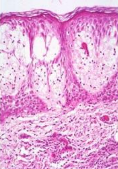 Intradermal blistering. The immune response causes spongiosis and lymphocyte infiltration.