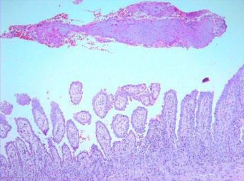 This patient comes to your clinic with onycholysis and Auspitz sign. What observations in this slide help you confirm that the patient has psoriasis?