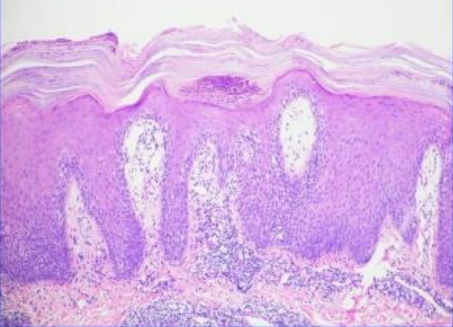 Hyperkeratosis, parakaratosis, acanthosis, Rete ridges, Munro micro abscess (collection of neutrophils) and thinning of the epidermis over the dermal papilla.