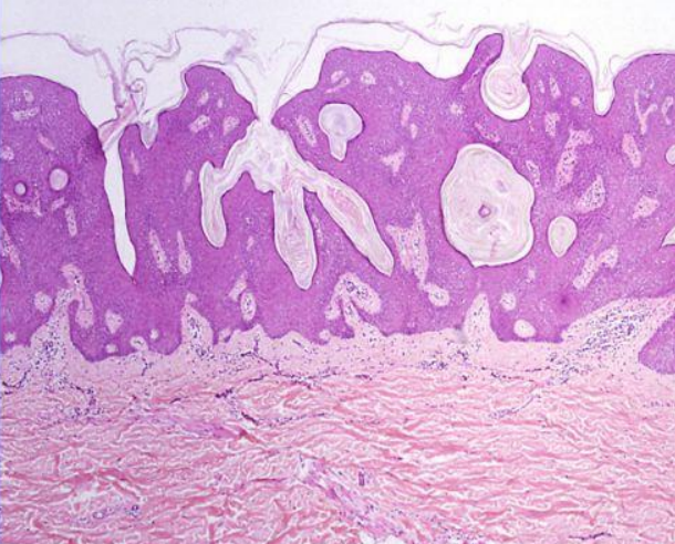 Seborrheic Keratosis. Horn cysts, hyperkeratosis and acanthosis with a straight base tells you its not malignant.