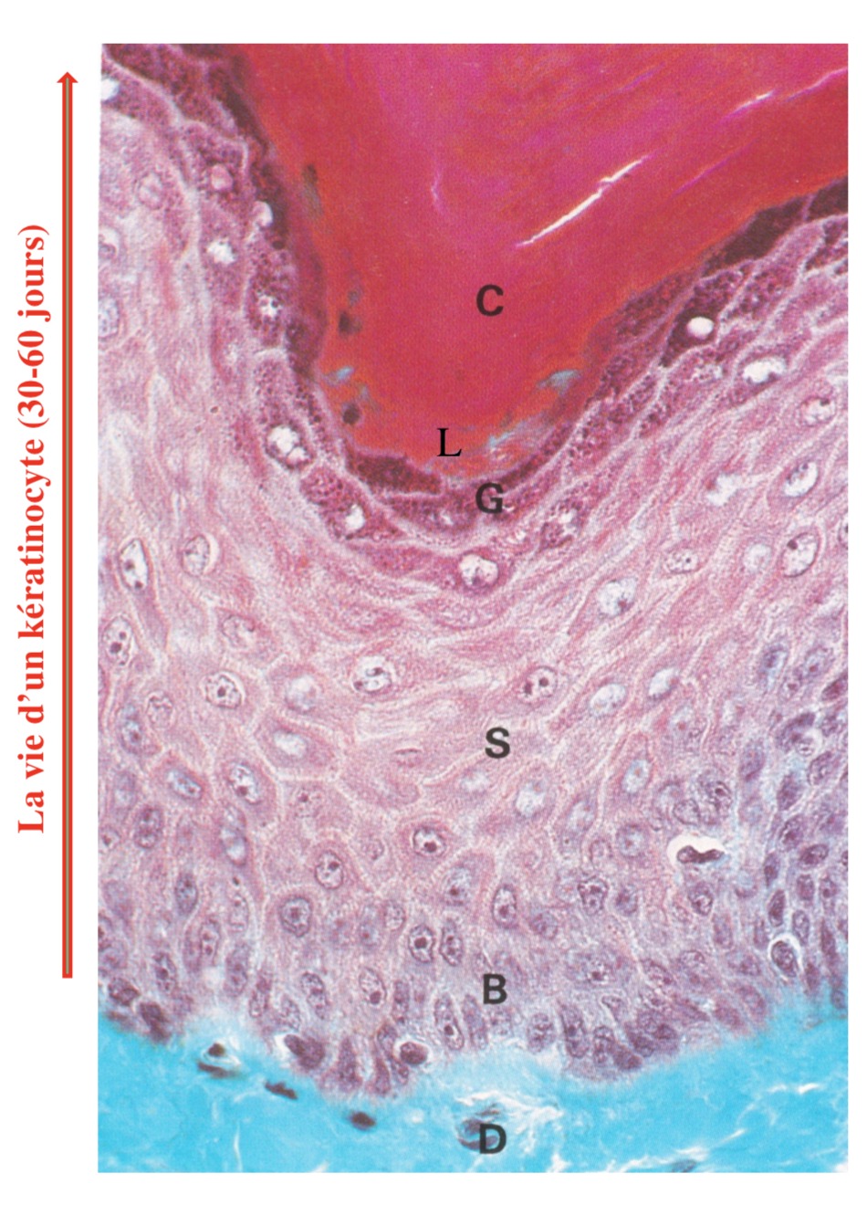 C- couche cornée L- couche claire G- couche granuleuse S-couche épineuse B- couche basale (ou germinative)