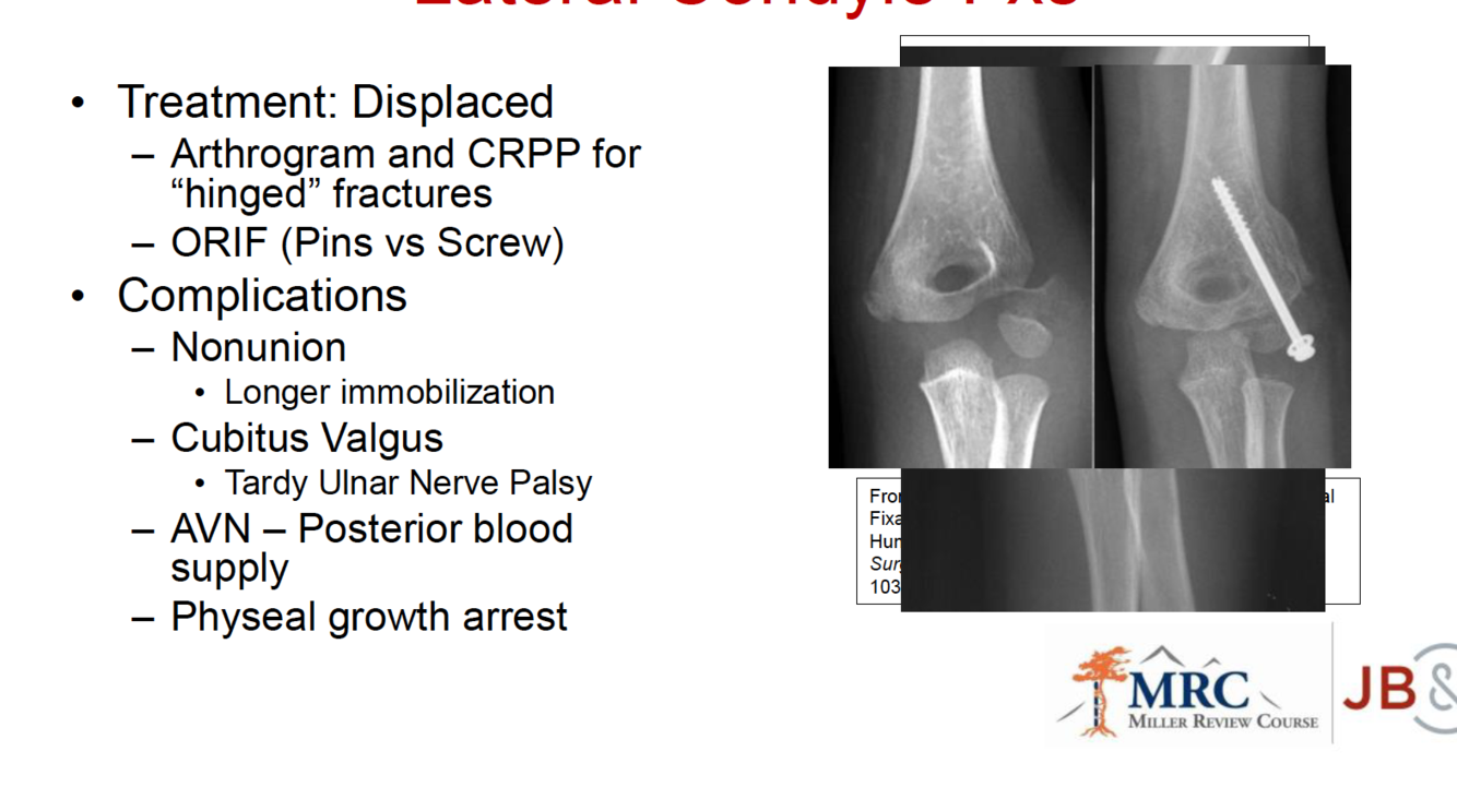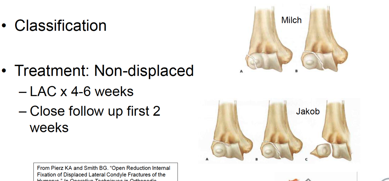 Describe the Milch and Jacob classification for lateral condyle fractures: