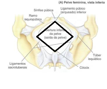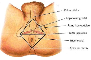 • Anteriormente: monte do púbis (sínfise púbica) • Lateralmente: faces mediais das coxas (tuberes isquiáticos) • Posteriormente: pregas e fenda interglútea (cóccix)
