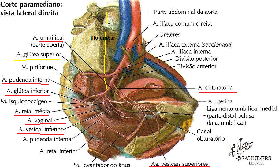 Ramos da ilíaca interna (Termina na margem superior do forame isquiático maior, dando origem às divisões (troncos) anterior e posterior)
