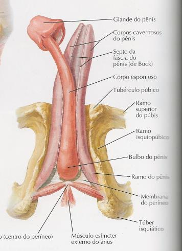 É formado por 3 corpos cilíndricos de tecido cavernoso erétil – 2 corpos cavernosos (dorsal) – Corpo esponjoso (ventral) • Revestimento externo: túnica albugínea • Fáscia do pênis (Buck): externamente a túnica albugínea – Revestimento membranáceo entre os corpos cavernosos e esponjoso • Corpo esponjoso: contém a parte esponjosa da uretra • Corpos cavernosos: Fundidos no plano mediano, exceto posteriormente, onde se separam para formar os ramos do pênis