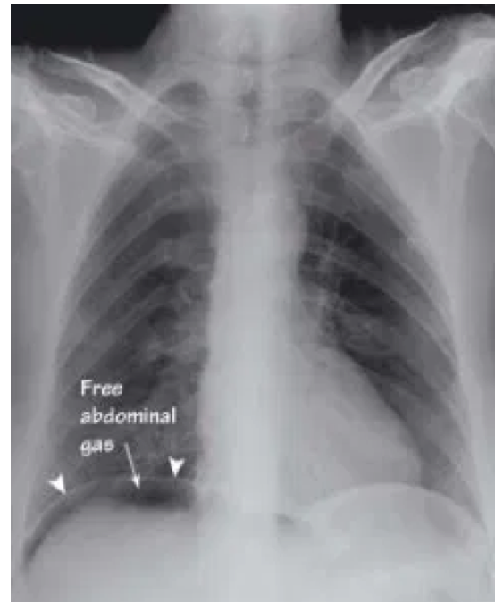 Erect CXR (check for air under the diaphragm)