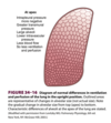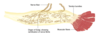 * The A cells secrete glucagon, the B cells secrete insulin, the D cells secrete somatostatin, and the F cells secrete pancreatic polypeptide. * The B cells, which are the most common and account for 60–75% of the cells in the islets, are generally located in the center of each islet. * They tend to be surrounded by the A cells, which make up 20% of the total, and the less common D and F cells. * The islets in the tail, the body, and the anterior and superior part of the head of the human pancreas have many A cells and few if any F cells in the outer rim, whereas the islets in the posterior part of the head of the pancreas have a relatively large number of F cells and few A cells.