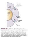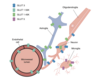 * GLUT-4 is the transporter in muscle and adipose tissue that is stimulated by insulin. * A pool of GLUT-4 molecules is maintained within vesicles in the cytoplasm of insulin-sensitive cells. * When the insulin receptors of these cells are activated, the vesicles move rapidly to the cell membrane and fuse with it, inserting the transporters into the cell membrane. * When insulin action ceases, the transporter-containing patches of membrane are endocytosed and the vesicles are ready for the next exposure to insulin. * Activation of the insulin receptor brings about the movement of the vesicles to the cell membrane by activating phosphatidylinositol 3-kinase.