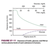* Fifty percent of an ingested glucose load is normally burned to CO2 and H2O; 5% is converted to glycogen; and 30–40% is converted to fat in the fat depots. * In diabetes, less than 5% of ingested glucose is converted to fat, despite a decrease in the amount burned to CO2 and H2O, and no change in the amount converted to glycogen. * Therefore, glucose accumulates in the bloodstream and spills over into the urine.