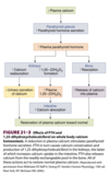 * **Glucocorticoids** lower plasma Ca2+ levels by inhibiting osteoclast formation and activity, but over long periods they cause osteoporosis by decreasing bone formation and increasing bone resorption. They decrease bone formation by inhibiting protein synthesis in osteoblasts. They also decrease the absorption of Ca2+ and PO43– from the intestine and increase the renal excretion of these ions. The decrease in plasma Ca2+ concentration also increases the secretion of PTH, and bone resorption is facilitated. * **Growth hormone** increases Ca2+ excretion in the urine, but it also increases intestinal absorption of Ca2+ and this effect may be greater than the effect on excretion, with a resultant positive calcium balance. * **Thyroid hormones** may cause hypercalcemia, hypercalciuria, and, in some instances, osteoporosis * **Oestrogens** prevent osteoporosis by inhibiting the stimulatory effects of certain cytokines on osteoclasts. * **Insulin** increases bone formation, and there is significant bone loss in untreated diabetes.