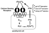* Receptors for calcitonin are found in bones and the kidneys. * Calcitonin lowers circulating calcium and phosphate levels. * It exerts its calcium-lowering effect by inhibiting bone resorption. This action is direct, and calcitonin inhibits the activity of osteoclasts in vitro. * It also increases Ca2+ excretion in the urine.