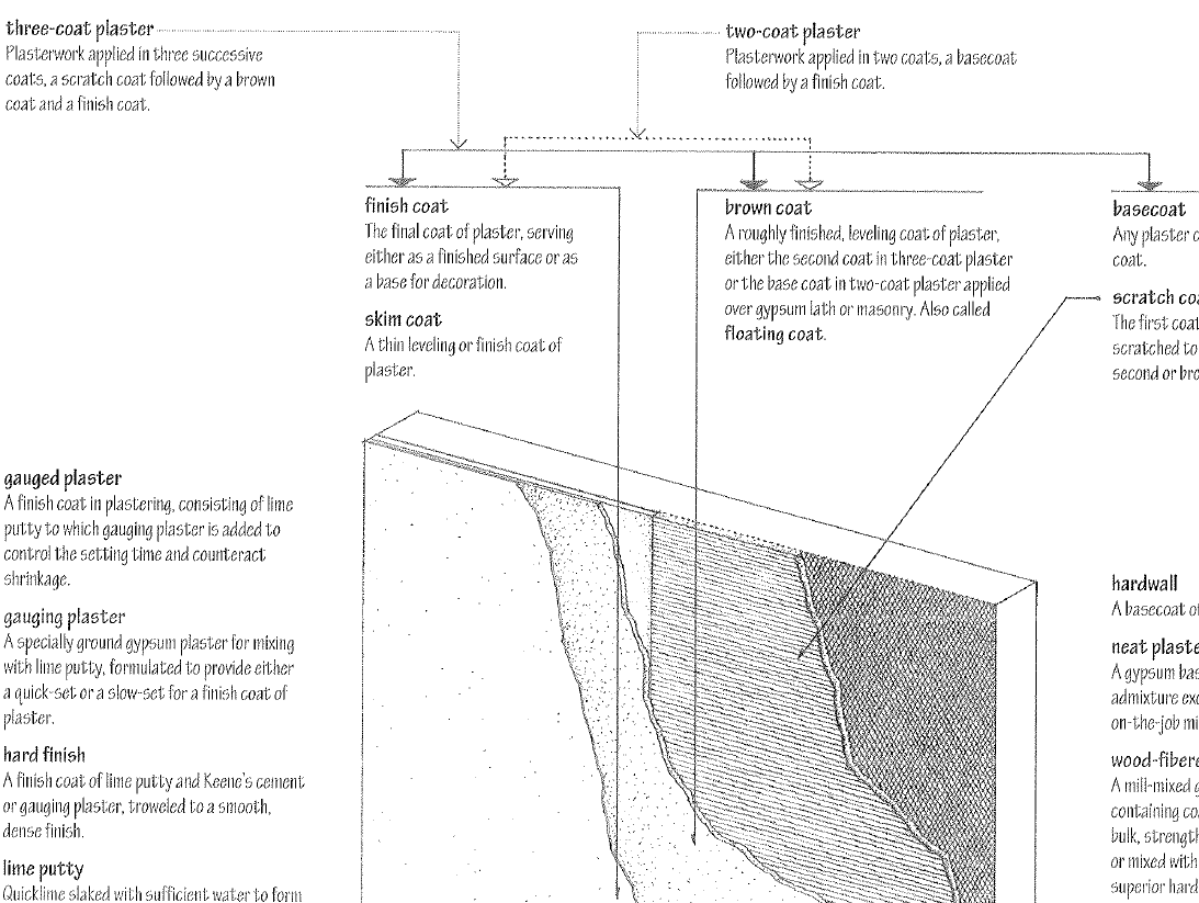 Plaster work applied in three successive coats, a scratch coat followed by a brown coat and a finish coat.