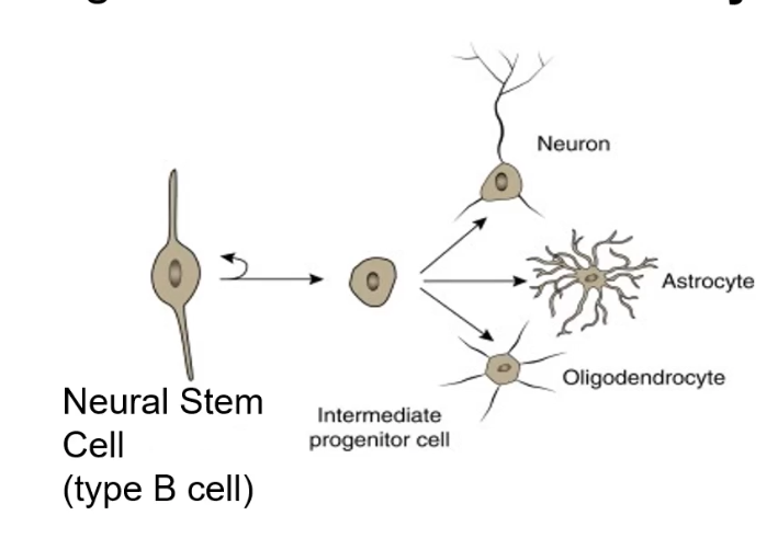 The notch receptor of the delta notch signalling pathway regulates differentiation of progenitor cells towards neurons. Cells contains notch receptors on their membranes, one of which is called delta, which when bound to a ligand will promote intracellular pathways that trigger its differentiation into a specific type of cell. This signalling pathway promotes the formation of of astrocytes, whilst inhibiting what 2 other cells?