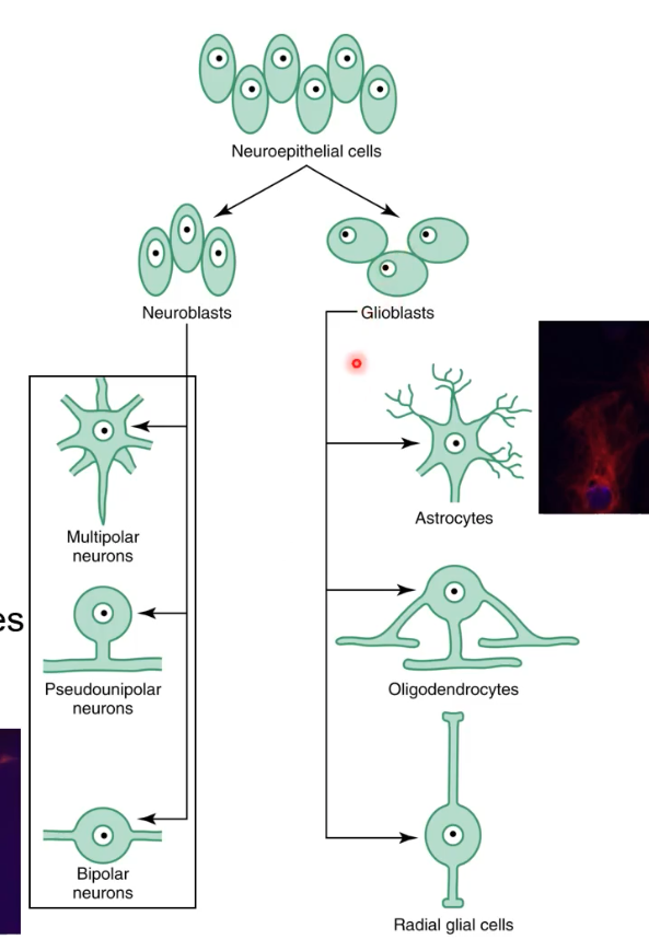 Neuroblast cells (naive neuronal cells) are an intermediate step from a neuronal stem cell before it differentiates into a specialised cell in the CNS. What are the 2 main groups these cells become from neuronal stem cells in the CNS?