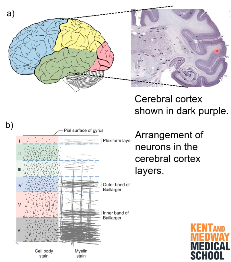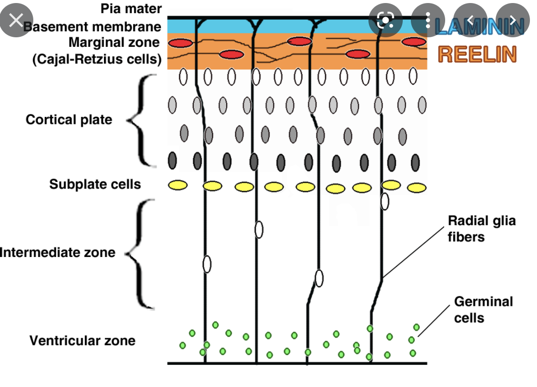In cortical development, which is the precursor for the cerebral cortex (the outer most layer of the brain that is grey matter, as per image below) where do the newly formed neurons begin?