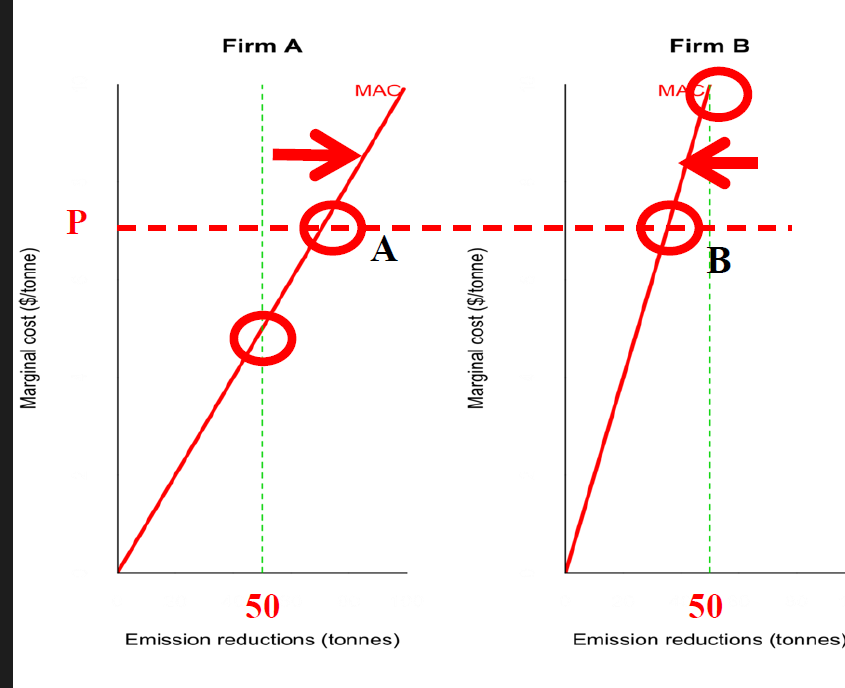 Firm A incentivized to do extra abatement and sell surplus permit to B which does less. Permit trading price is P.