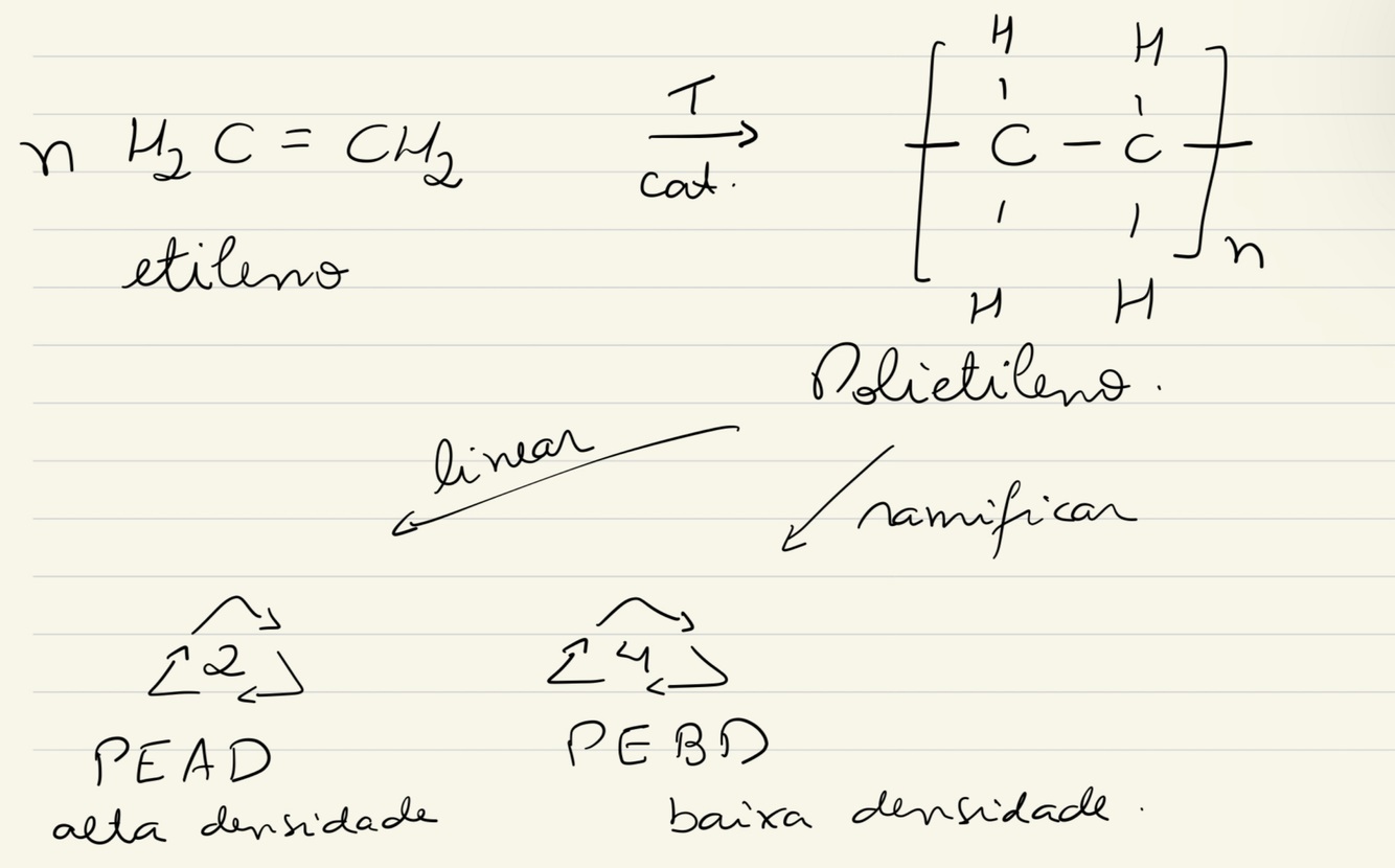 Obs: ambos são monômeros de adição formados a partir do etileno, porém, em seus processos de síntese são utilizados diferentes catalisadores, resultando em uma forma mais compactada (PEAD) e uma de menor densidade (PEBD).