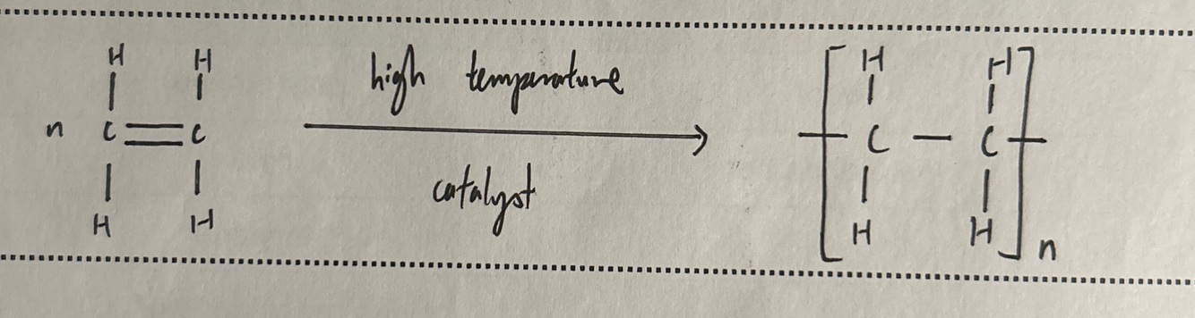 alkenes undergo addition polymerisation at high temperature and pressure and in the presence of a catalyst to form polymers