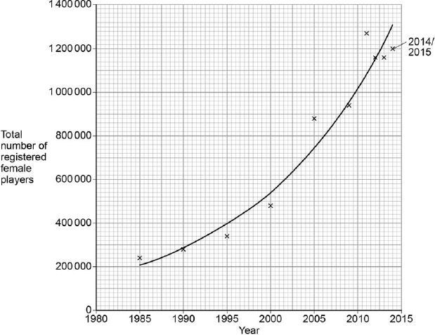 E.g. the number of females registered has risen significantly, with an increase from just over 200000 in 1985 to 1300000 in 2015, which could have come from an increase in equal opportunities. There has been a steady rise year on year with no drops in the rate of the rise, which could be facilitated by greater media coverage of the women’s game, which in turn has led to more female roles models. The rise has increased since 2005 which indicates the momentum has increased, eg due to more female provision / clubs.