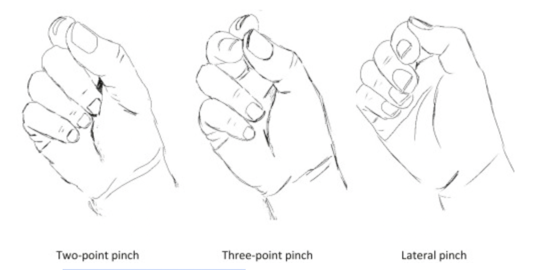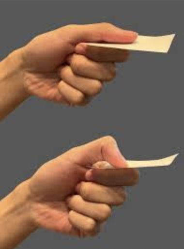 Lateral pinch holding a piece of paper (you across from the patient) and pulling away from them