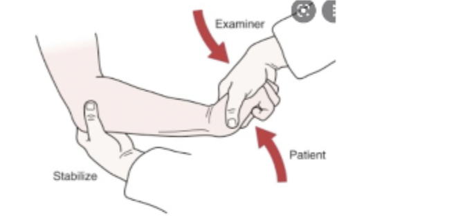 Stabilize elbow and palpate lateral epicondyle. With a closed fist, pt supinates and extends the wrist against resistance (of you pushing them into flexion)