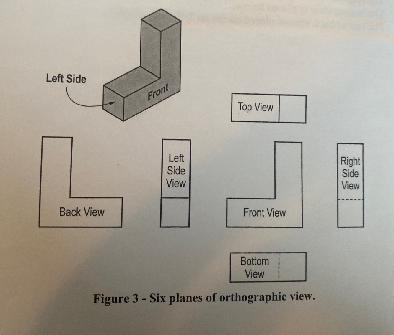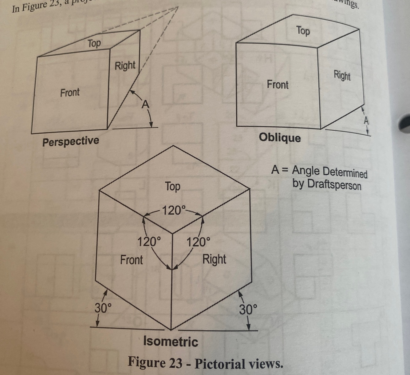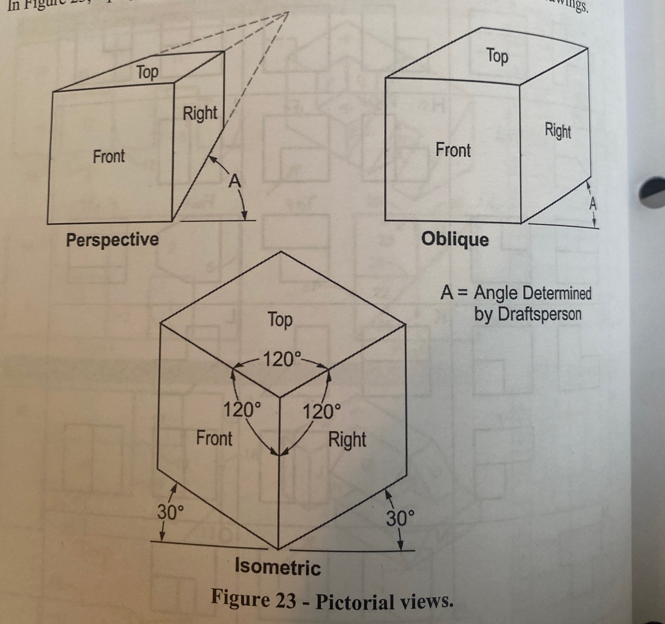 Perspective: less common in mechanical trades. Front view is undistorted and the top and right side taper into distance