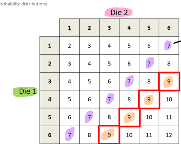 - there are four possible combinations to add to 9 and 36 total outcomes