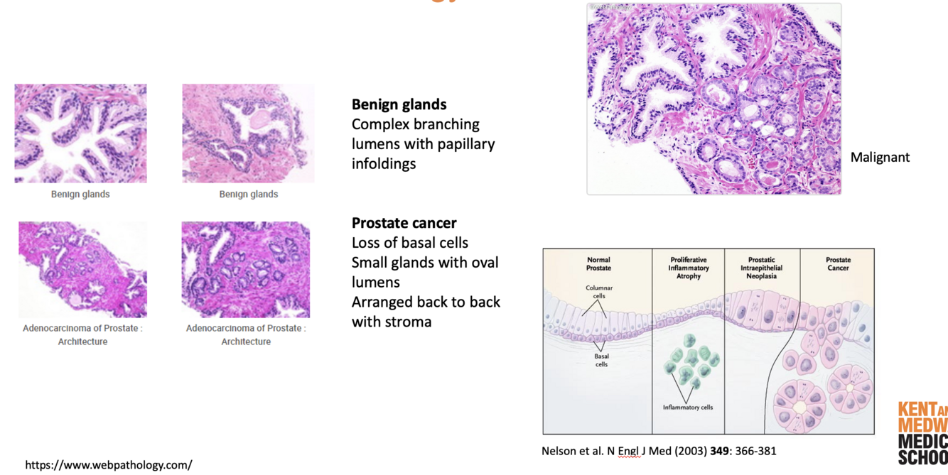 Are the following attributable to the histology of prostate cancer or benign glands?
