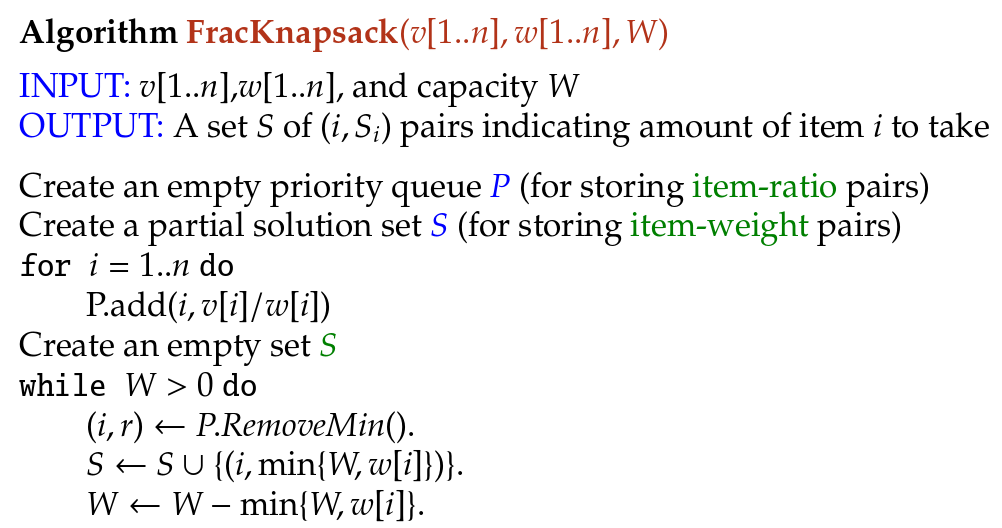 Pseudo code for fractional knapsack (greedy) algorithm: