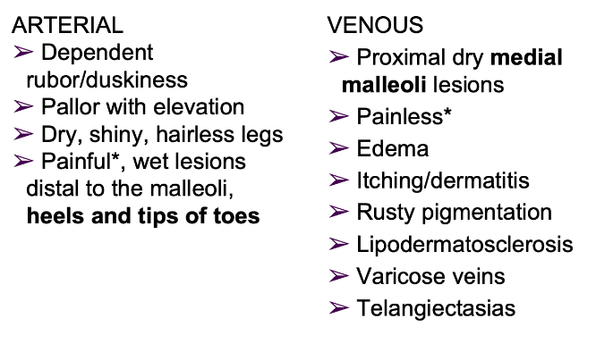 Describe the main differences between arterial & venous insufficiency