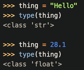 Python is a DYNAMICALLY typed language. This means that the Python interpreter does type checking only when CODE RUNS, and that the type of a variable is ALLOWED TO CHANGE over its lifetime.