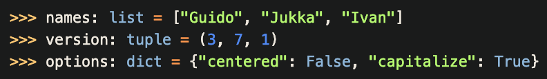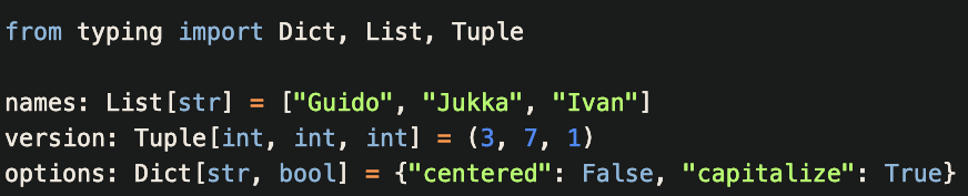 You should use the special types defined in the typing module. These types add syntax for specifying the types of elements of composite types. You can write the following: