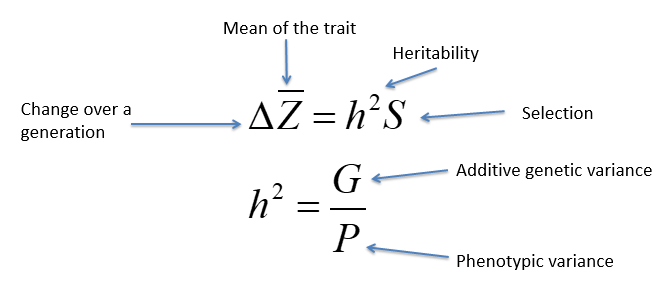 Evolution = heritability x selection. Evolution also called response of selection. H^2 is the heritability, ranges from 0-1. S is selection.