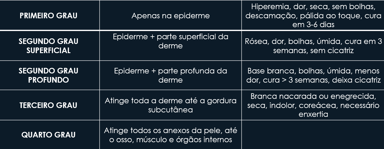 Feridas traumáticas causadas por agentes térmicos, químicos, elétricos, radioativos ou fricção que atuam nos tecidos de revestimento do corpo humano, determinando destruição parcial ou total da pele e seus anexos, podendo atingir camadas mais profundas, como tecido celular subcutâneo, músculos, tendões e ossos