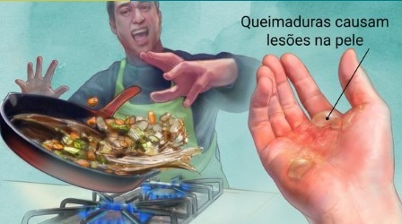 Para interromper o processo de queimadura, pode-se irrigar com água em temperatura ambiente por até 15 minutos.