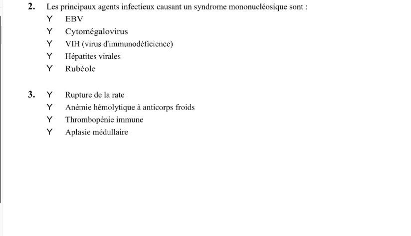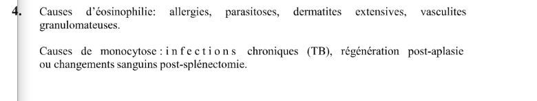 nomme 3 causes d’éosinophilie et 2 causes de monocytoses