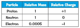 Give the relative mass and relative charge of electrons, protons and neutrons.