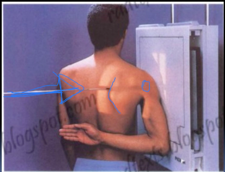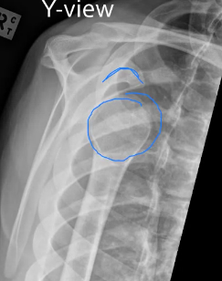 The Y-view is taken by aligning the x-ray beams parallel to the plane of the scapula so that it can be seen “floating” over the thoracic wall. In a healthy patient, the humeral head should be in alignment with the glenoid cavity of the scapula.
