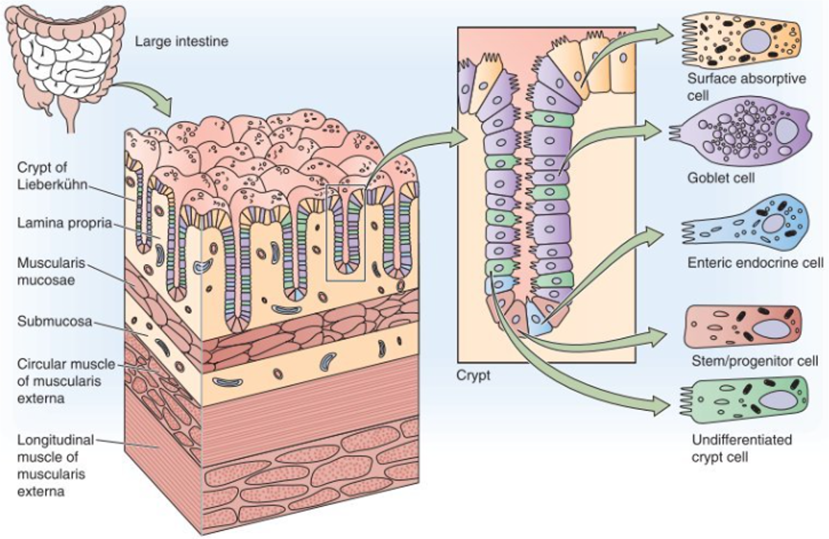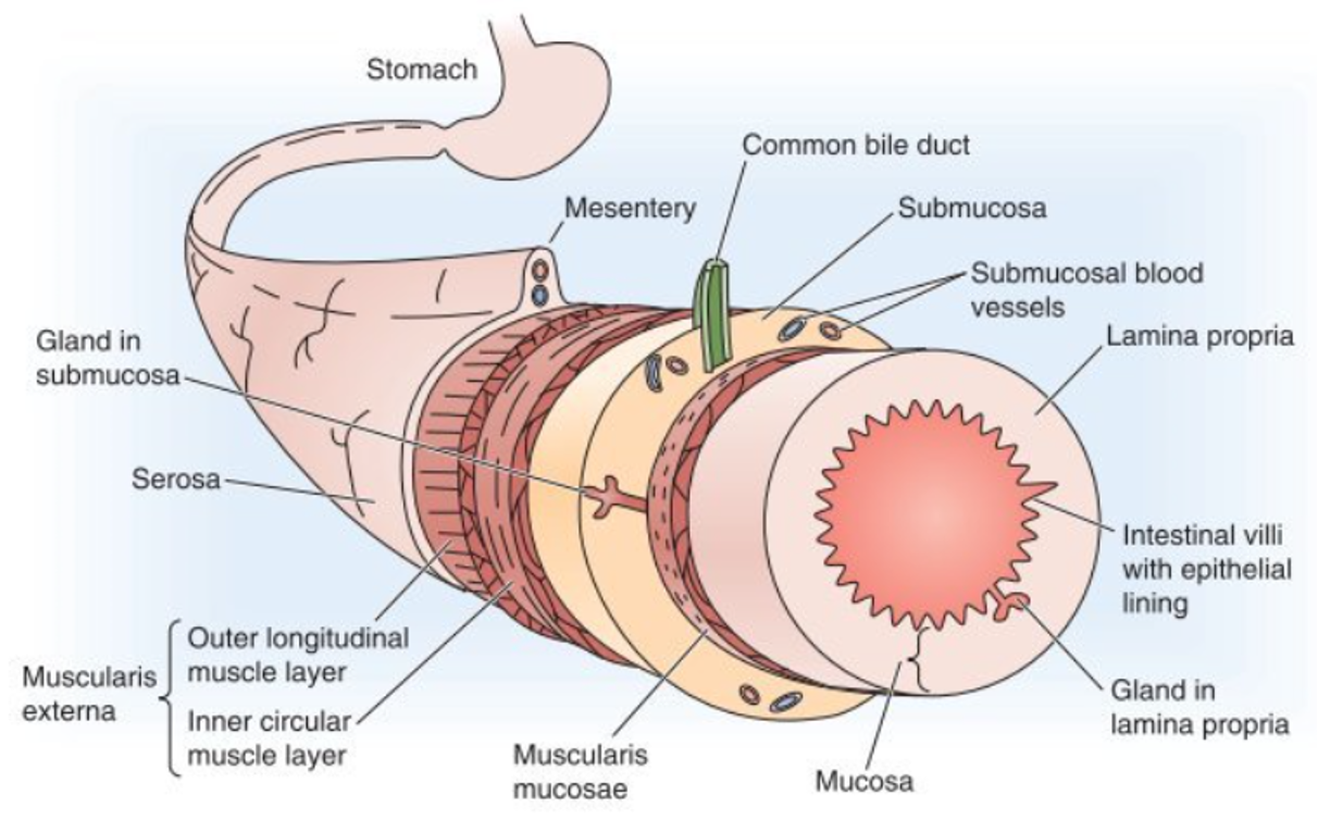 Explain the layers in GI (in detail cells e.g. in intestines)
